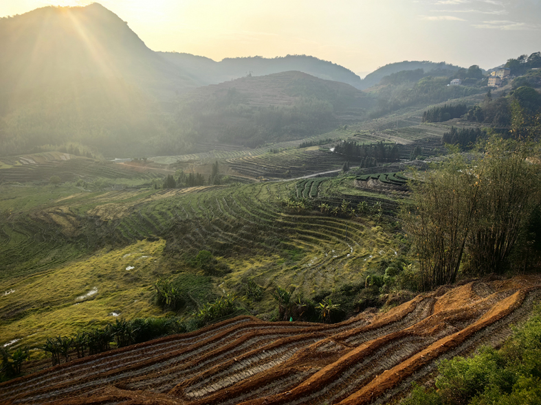 冬天到了,生靈歸巢,梯田蜿蜒裸露,勾勒出大地的筋骨,指紋般的線條蛛網似的匍匐在山野中,靜靜地等待春天的到來。在偶有霧凇的時刻,銀裝素裹更顯出梯田的靜謐,仿佛時光停下腳步,留下了天與地的空靈。